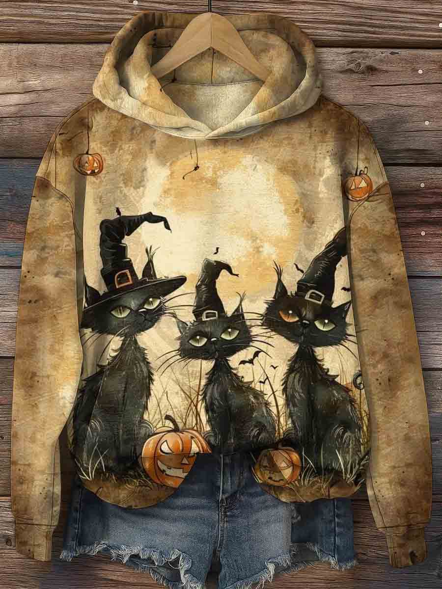 Halloween Witch Cat Art Illustration Printed Casual Hoodie